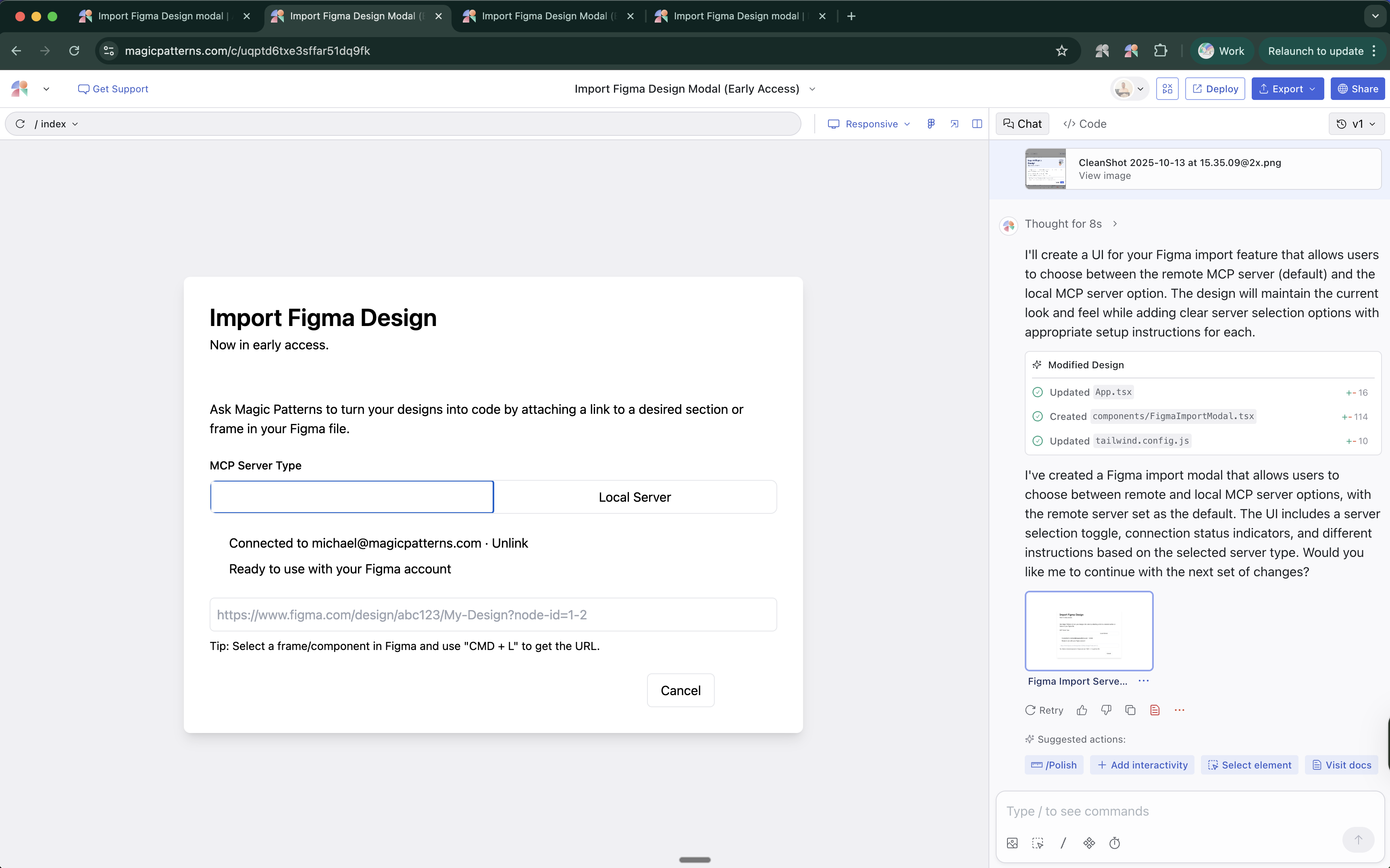 After we got the new way to work in our app, and after early testing, the only disadvantage to remote mcp was timeouts on large component imports. But that seemed like an edge case for advanced users. So now was the time to think about the user interface.